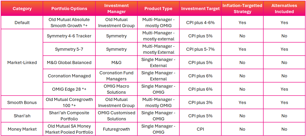 - The OMEGS section in SuperFund provides members with an excellent default option, because many members are not completely confident when making investment choices. This JMC Choice default option is a good “one-size-fits-all” investment appropriate for the needs of the majority of OMEGS members. If you don’t actively make an investment choice, you will be invested in the JMC Choice option, the Old Mutual Absolute Smooth Growth Portfolio.